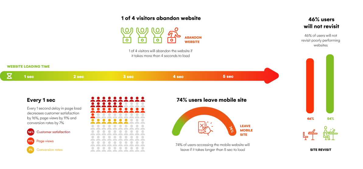 Website speed can have a huge impact on your overall conversions and business performance. We live in a fast and changing world where we’ve come to expect instant response, especially when it comes to the internet. One out of four online users will abandon a website page after four seconds of no activity. Furthermore, Google takes performance and speed into consideration when it comes to ranking a website.